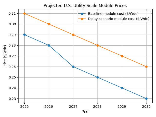 Figure 1 – Projected utility‑scale module prices. The baseline scenario assumes steady cost declines as domestic manufacturing scales, while the delay scenario assumes persistent trade or policy disruptions.