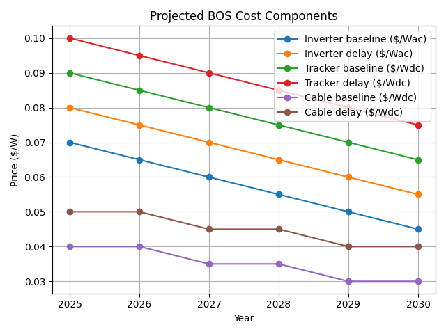 Figure 2 – Projected balance‑of‑system costs. Inverters, trackers and cabling show gradual declines; delay scenarios assume slower cost reductions due to supply constraints.