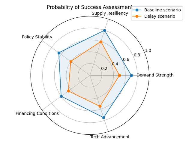 Figure 4 – Probability‑of‑success assessment. The baseline scenario (blue) reflects moderate strength in demand and supply chain resiliency but limited policy stability. The delay scenario (red) shows lower probabilities across most dimensions due to policy and trade uncertainties.