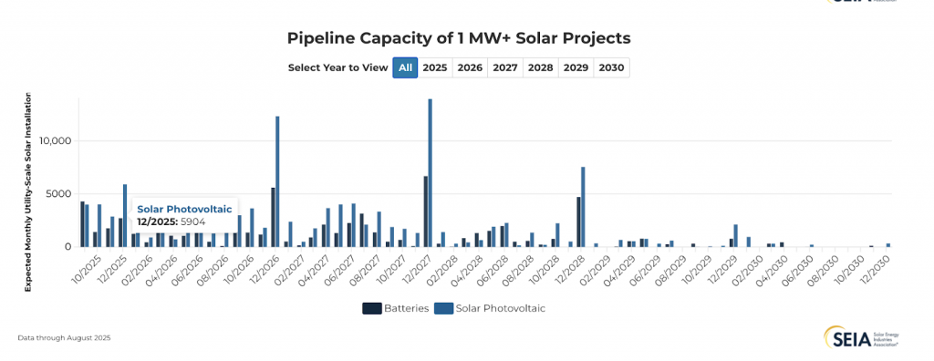 Figure 5 – Monthly pipeline capacity for 2025 from SEIA’s Major Projects List (data through Aug 2025). The data underscore that even if installation volumes slowed in mid‑2025, a large backlog of projects is scheduled for completion in late 2025.